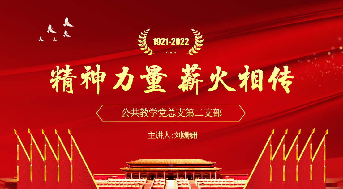 在中国共产党成立101周年之际,为进一步深入推进“四史”学习教育,激励支部党员赓续共产党人精神血脉,铭记党的历史,讴歌党的光辉历程,公共教学党总支于7月6日在崇文楼A711会议室开展以“精神力量 薪火相传—庆祝中国共产党成立101周年”为主题的党课讲授活动。主讲人为第二支部书记刘姗姗。
