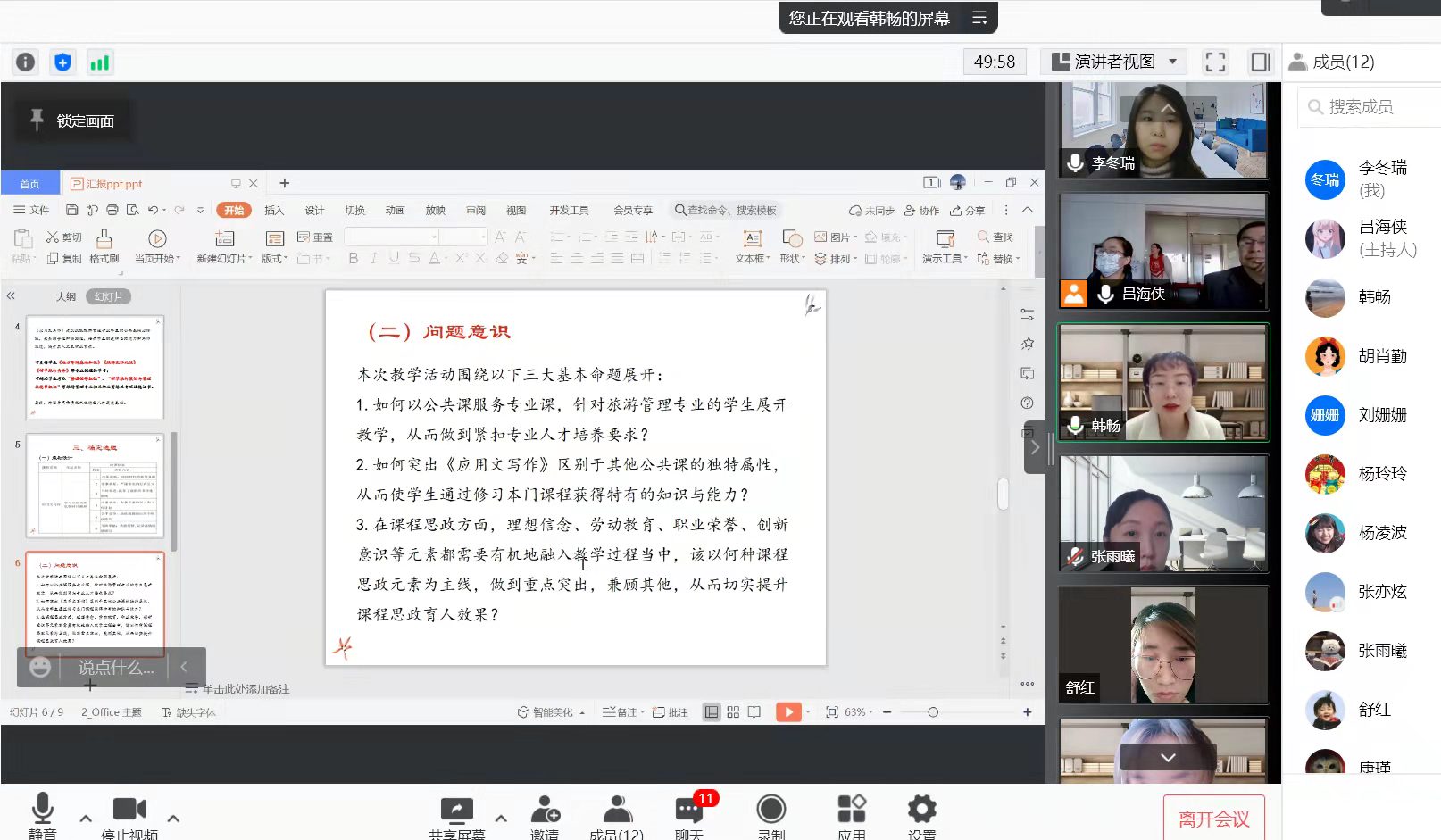 随后,各团队负责人分别就备赛思路、资料准备、近期完成的工作、存在问题及下一步计划做了详细汇报。南欢部长强调,教师教学能力比赛是教师提升能力、展示自我的平台,各参赛团队要高度重视,精心准备,抓住契机,取得佳绩。