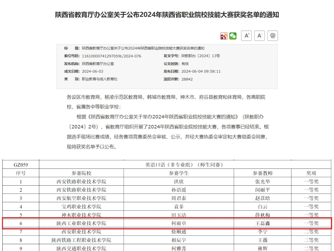6月3日,省教育厅公布了2024年陕西省职业院校技能大赛获奖名单,我院公共课教学部教师王磊鑫、信息工程学院学生何雨卓荣获非英语专业组“英语口语”赛项一等奖。