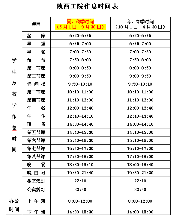 5.根据学校教学工作计划,自2021年5月6日(星期四)起,全校执行夏季作息时间表,请各部门根据夏季作息时间表妥善安排好各项工作,确保学校正常教学和工作秩序。