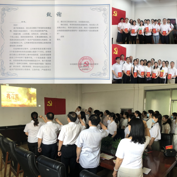 最后,总支书记南欢强调,公共教学党总支为全体党员精心制作了致谢函,表达对党员疫情期间不忘初心、牢记使命和勇于担当的慰勉和感谢。他说,不管是汶川地震还是疫情期间,全体党员积极捐款,一声响应就是一份忠诚,一笔捐款就是一片爱心。一份份编号独一无二的“红色收据”,是党中央对所有党员和行动的肯定,是广大党员在疫情防控期间为国为党分忧、倾情付出的最好见证,突出表现了党员的先锋模范作用,极大增强了各位党员的荣誉感和责任感。希望全体党员能妥善留存,让并时刻牢记党员身份,在我院建设双高校、建设新校区的新时期,发挥更大的作用,做出更大的贡献。