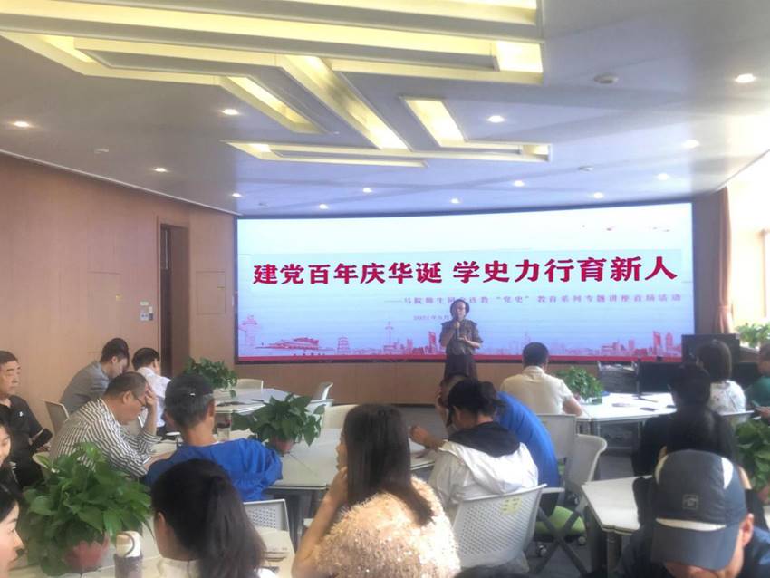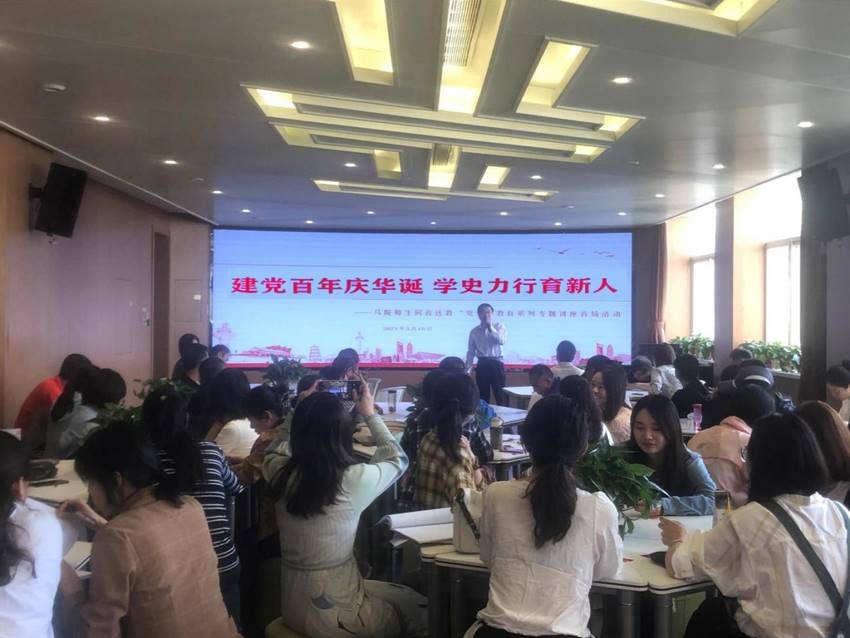 5月18日下午,公共教学党总支组织所辖数语教学、英语教学、马院、体育部、继教美育国际等5个支部全体党员,在崇文南楼三层VR智慧思政实训基地举行党史学习教育专题讲座,讲座由由马克思主义学院党支部张金英博士和秦马研习社成员李茹同学分阶段主讲。公共教学党总支书记南欢同志主持讲座。