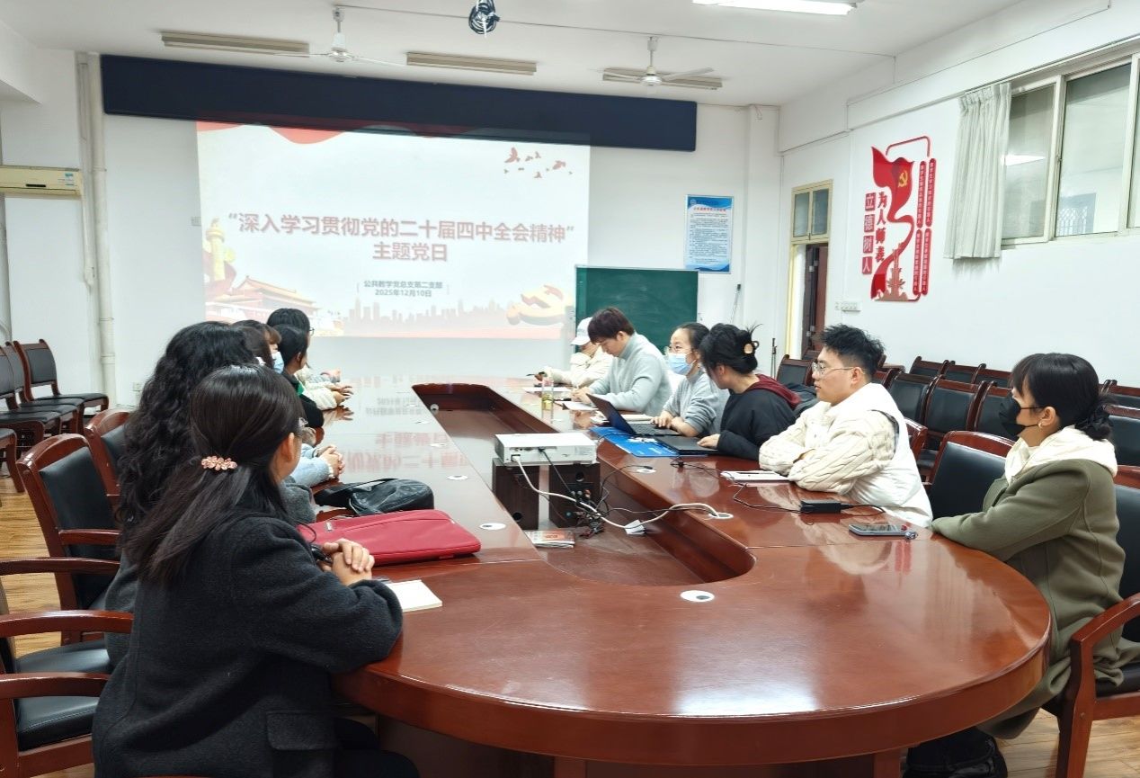 为深入学习贯彻党的二十届四中全会精神,推动全会精神与大学英语教学科研工作深度融合,12月10日下午,公共教学党总支第二党支部在崇文楼A501会议室召开主题党日活动。活动由支部书记张亦炫主持,支部全体党员参加。